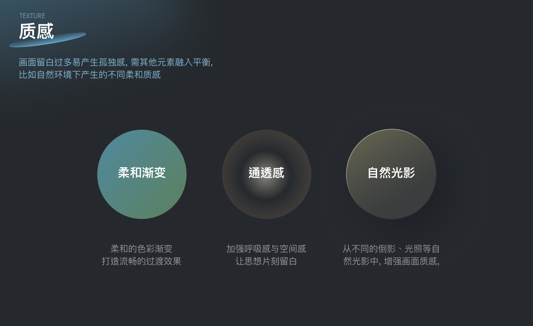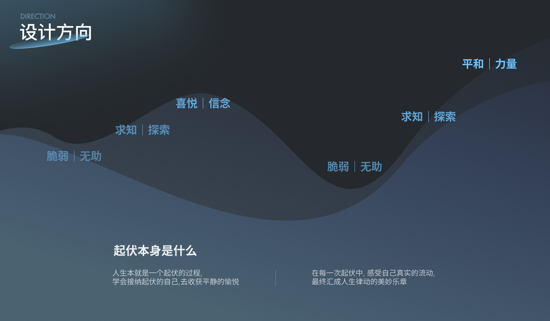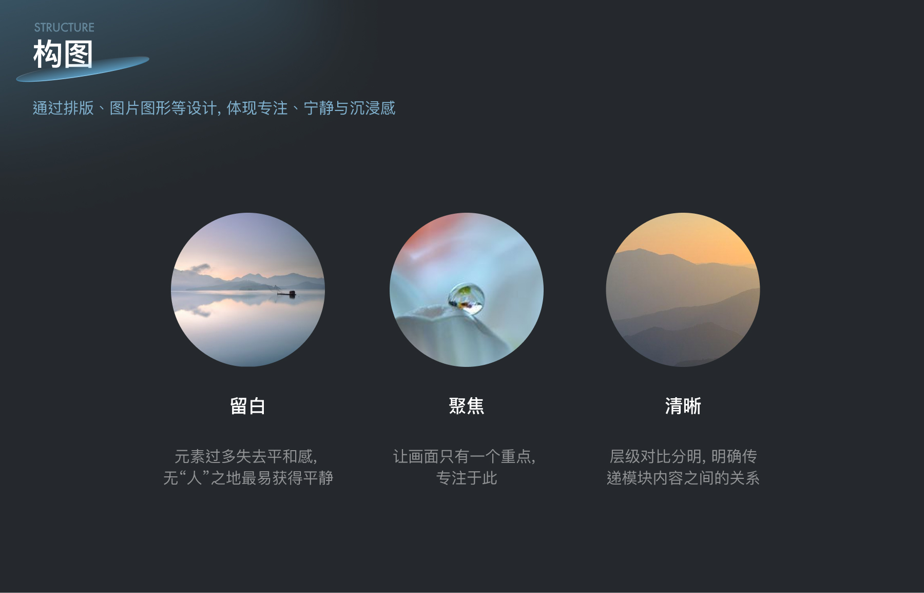 首屏模块的设计旨在为用户创造一种独特的空间感受:平静感|沉浸感|呼吸感。