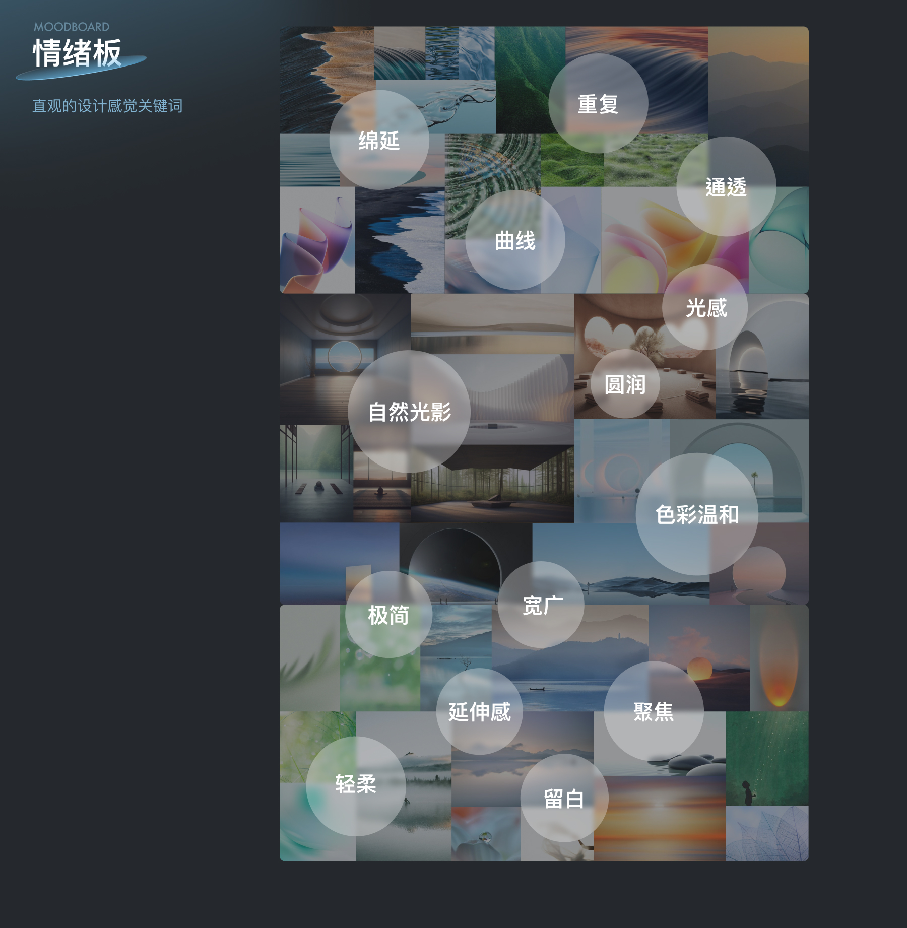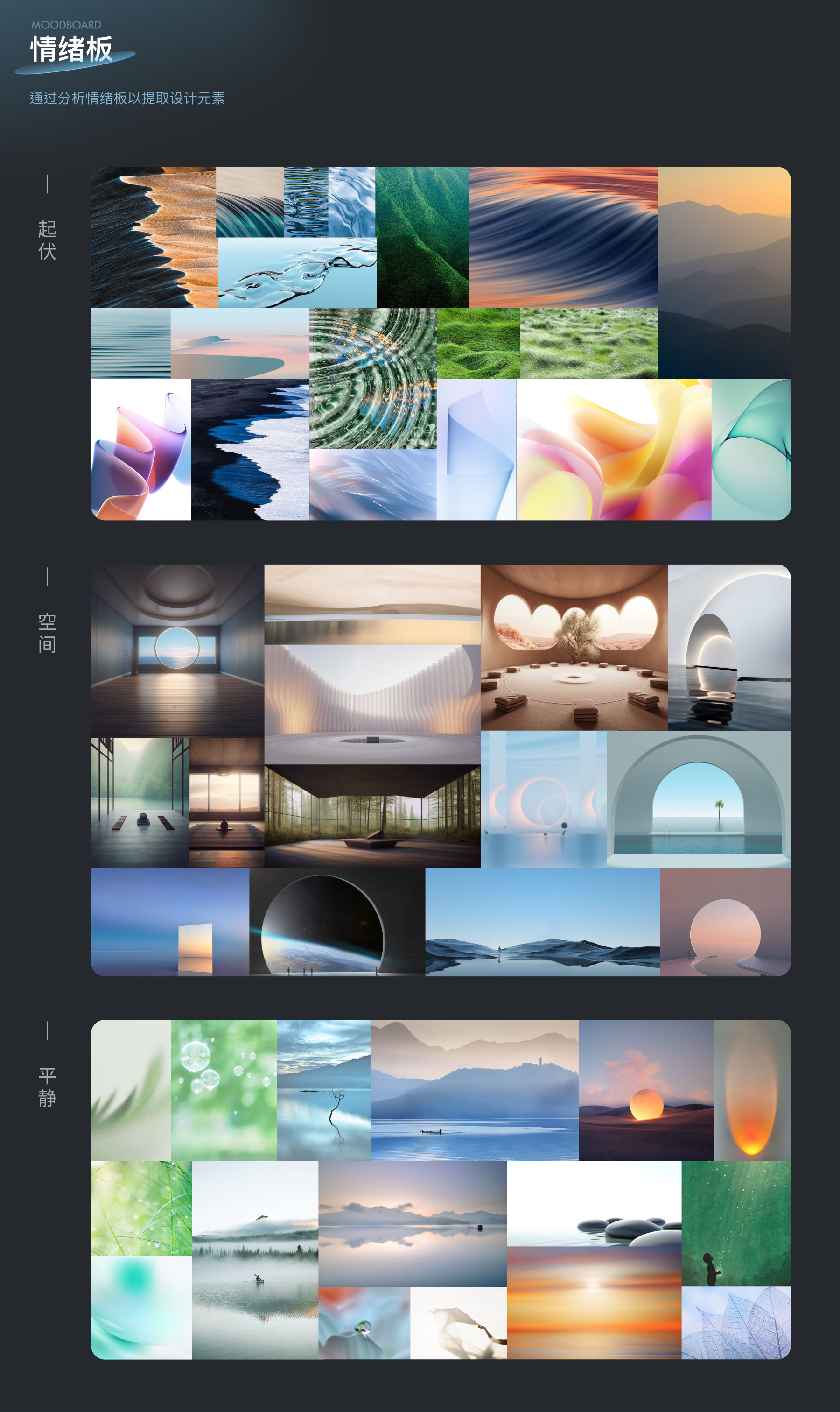 在这个空间中, 试图向用户构建愉悦平和感的精神空间。通过提取产品关键词,将抽象的感觉以视觉语言具体化,为构建设计语言和指导具体设计场景提供基础。这一过程旨在通过关键词的具象表达,以确保设计语言的一致性和设计场景的有针对性。